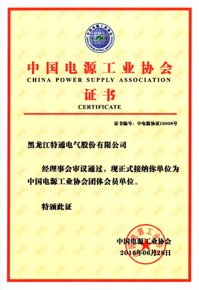 2016年06月15日特通電氣各項(xiàng)標(biāo)準(zhǔn)符合中國電源工業(yè)協(xié)會(huì)的要求,并成為“中國電源工業(yè)協(xié)會(huì)”會(huì)員單位。