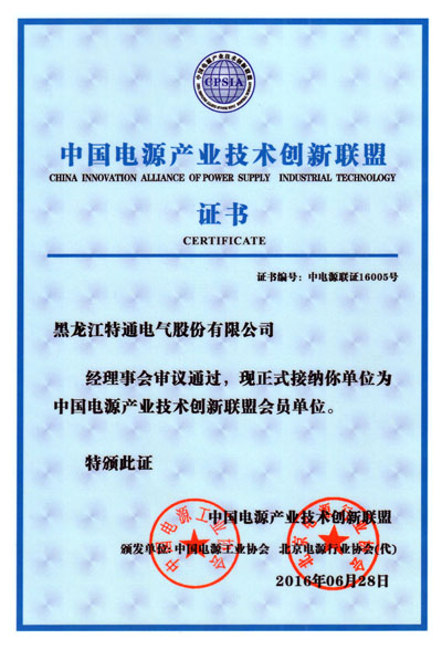 特通電氣各項(xiàng)標(biāo)準(zhǔn)符合中國電源工業(yè)協(xié)會(huì)的要求,于2016年06月15日成為“中國電源產(chǎn)業(yè)技術(shù)創(chuàng)新聯(lián)盟”會(huì)員單位。